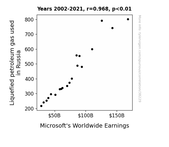 This means 93.7% of the change in the one variable (i.e., Microsoft's Worldwide Earnings) is predictable based on the change in the other (i.e., Liquefied petroleum gas used in Russia) over the 20 years from 2002 through 2021.