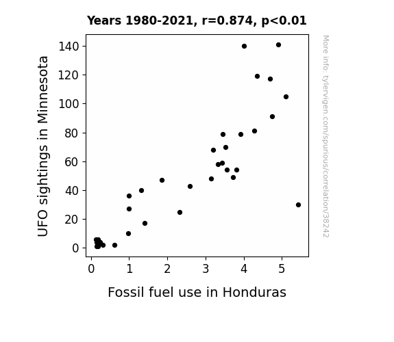 This means 76.3% of the change in the one variable (i.e., Fossil fuel use in Honduras) is predictable based on the change in the other (i.e., UFO sightings in Minnesota) over the 42 years from 1980 through 2021.