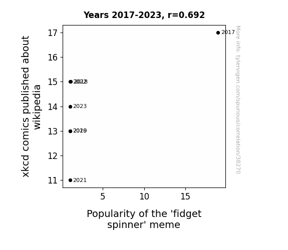 This means 47.9% of the change in the one variable (i.e., Popularity of the 'fidget spinner' meme) is predictable based on the change in the other (i.e., xkcd comics published about wikipedia) over the 7 years from 2017 through 2023.