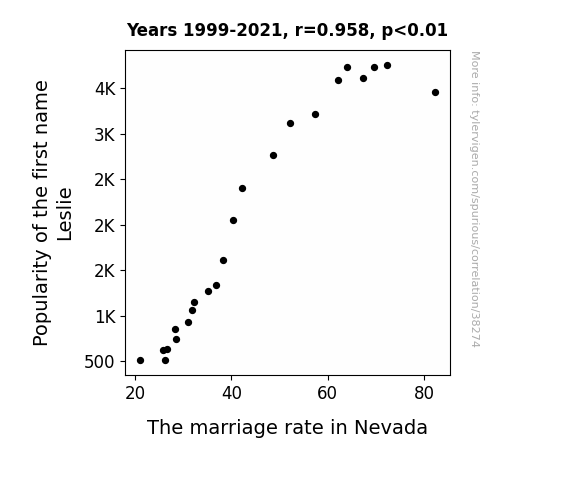 This means 91.7% of the change in the one variable (i.e., The marriage rate in Nevada) is predictable based on the change in the other (i.e., Popularity of the first name Leslie) over the 23 years from 1999 through 2021.