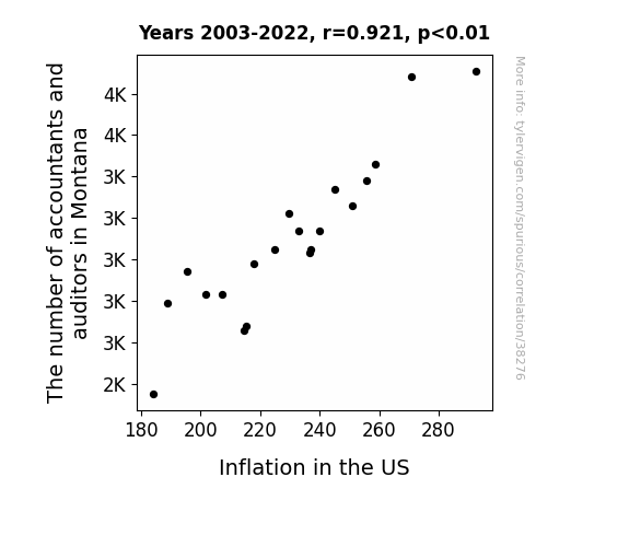 This means 84.8% of the change in the one variable (i.e., Inflation in the US) is predictable based on the change in the other (i.e., The number of accountants and auditors in Montana) over the 20 years from 2003 through 2022.