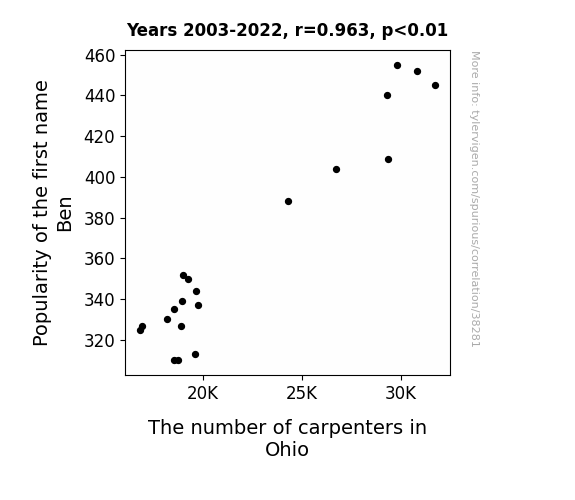 This means 92.7% of the change in the one variable (i.e., The number of carpenters in Ohio) is predictable based on the change in the other (i.e., Popularity of the first name Ben) over the 20 years from 2003 through 2022.