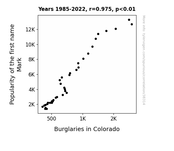This means 95% of the change in the one variable (i.e., Burglaries in Colorado) is predictable based on the change in the other (i.e., Popularity of the first name Mark) over the 38 years from 1985 through 2022.