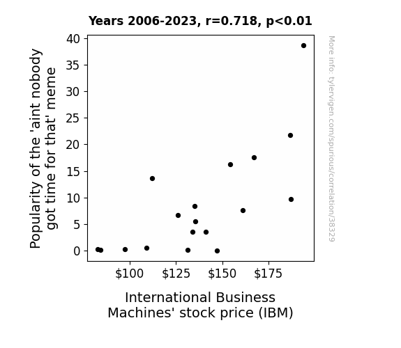 This means 51.5% of the change in the one variable (i.e., International Business Machines' stock price (IBM)) is predictable based on the change in the other (i.e., Popularity of the 'aint nobody got time for that' meme) over the 18 years from 2006 through 2023.