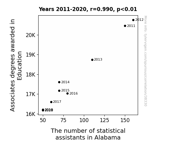 This means 98.1% of the change in the one variable (i.e., The number of statistical assistants in Alabama) is predictable based on the change in the other (i.e., Associates degrees awarded in Education) over the 10 years from 2011 through 2020.