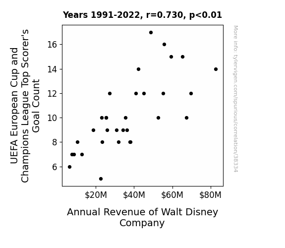 This means 53.3% of the change in the one variable (i.e., Annual Revenue of Walt Disney Company) is predictable based on the change in the other (i.e., UEFA European Cup and Champions League Top Scorer's Goal Count) over the 32 years from 1991 through 2022.