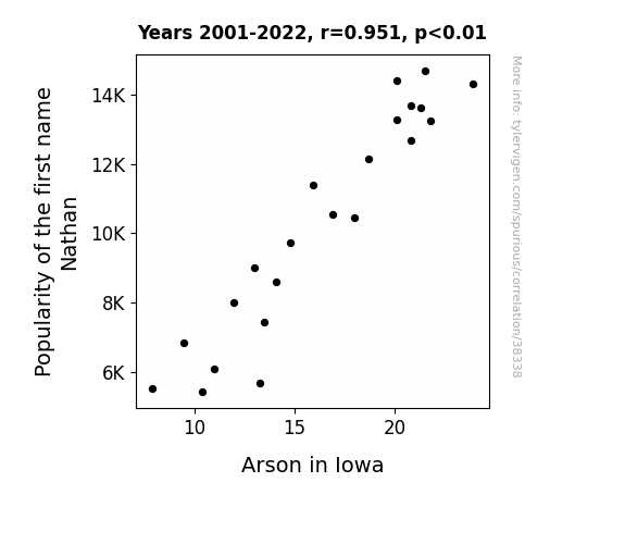 This means 90.4% of the change in the one variable (i.e., Arson in Iowa) is predictable based on the change in the other (i.e., Popularity of the first name Nathan) over the 22 years from 2001 through 2022.