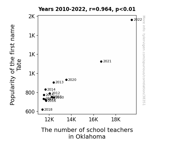 This means 93% of the change in the one variable (i.e., The number of school teachers in Oklahoma) is predictable based on the change in the other (i.e., Popularity of the first name Tate) over the 13 years from 2010 through 2022.