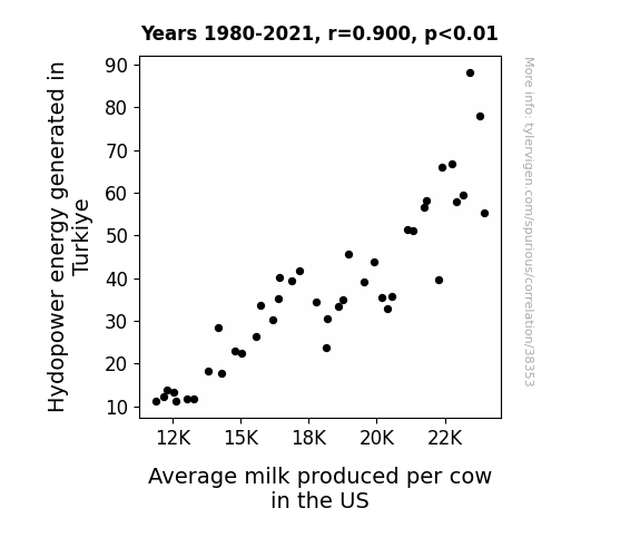 This means 81% of the change in the one variable (i.e., Average milk produced per cow in the US) is predictable based on the change in the other (i.e., Hydopower energy generated in Turkiye) over the 42 years from 1980 through 2021.