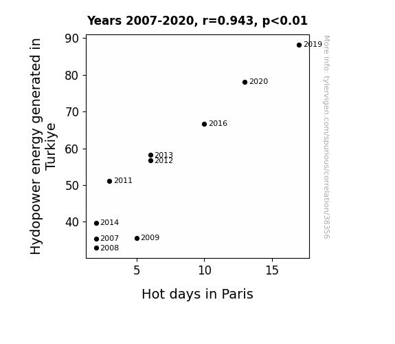 This means 88.9% of the change in the one variable (i.e., Hot days in Paris) is predictable based on the change in the other (i.e., Hydopower energy generated in Turkiye) over the 10 years from 2007 through 2020.
