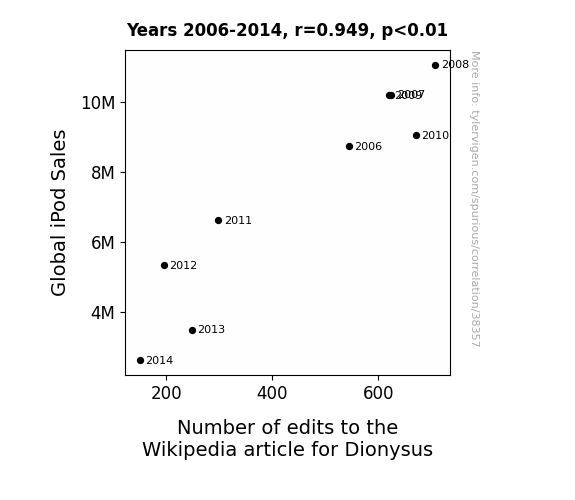 This means 90.1% of the change in the one variable (i.e., Number of edits to the Wikipedia article for Dionysus) is predictable based on the change in the other (i.e., Global iPod Sales) over the 9 years from 2006 through 2014.