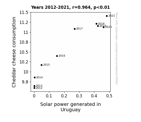 This means 92.9% of the change in the one variable (i.e., Solar power generated in Uruguay) is predictable based on the change in the other (i.e., Cheddar cheese consumption) over the 10 years from 2012 through 2021.