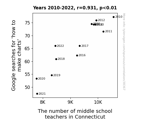 This means 86.7% of the change in the one variable (i.e., The number of middle school teachers in Connecticut) is predictable based on the change in the other (i.e., Google searches for 'how to make charts') over the 13 years from 2010 through 2022.