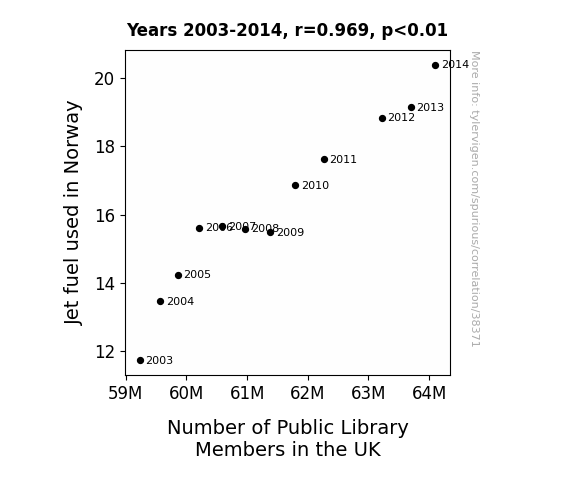 This means 93.8% of the change in the one variable (i.e., Number of Public Library Members in the UK) is predictable based on the change in the other (i.e., Jet fuel used in Norway) over the 12 years from 2003 through 2014.