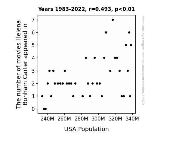 This means 24.3% of the change in the one variable (i.e., USA Population) is predictable based on the change in the other (i.e., The number of movies Helena Bonham Carter appeared in) over the 40 years from 1983 through 2022.