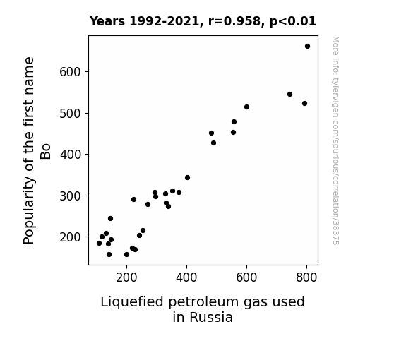 This means 91.8% of the change in the one variable (i.e., Liquefied petroleum gas used in Russia) is predictable based on the change in the other (i.e., Popularity of the first name Bo) over the 30 years from 1992 through 2021.