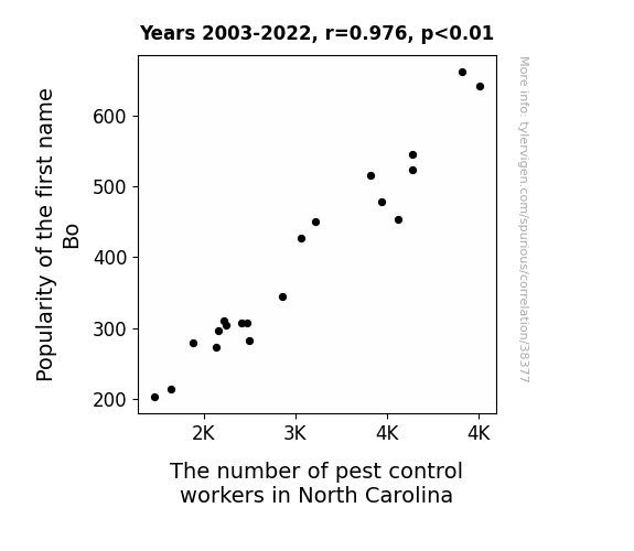 This means 95.3% of the change in the one variable (i.e., The number of pest control workers in North Carolina) is predictable based on the change in the other (i.e., Popularity of the first name Bo) over the 20 years from 2003 through 2022.
