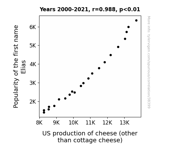 This means 97.7% of the change in the one variable (i.e., US production of cheese (other than cottage cheese)) is predictable based on the change in the other (i.e., Popularity of the first name Elias) over the 22 years from 2000 through 2021.
