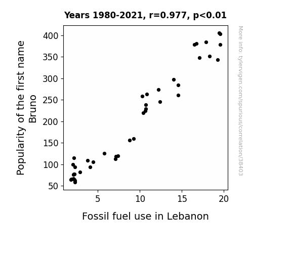 This means 95.5% of the change in the one variable (i.e., Fossil fuel use in Lebanon) is predictable based on the change in the other (i.e., Popularity of the first name Bruno) over the 42 years from 1980 through 2021.