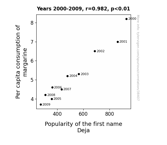 This means 96.3% of the change in the one variable (i.e., Popularity of the first name Deja) is predictable based on the change in the other (i.e., Per capita consumption of margarine) over the 10 years from 2000 through 2009.