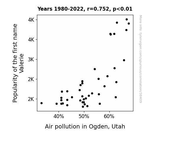 This means 56.6% of the change in the one variable (i.e., Air pollution in Ogden, Utah) is predictable based on the change in the other (i.e., Popularity of the first name Valerie) over the 43 years from 1980 through 2022.