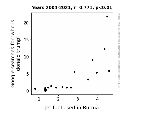 This means 59.5% of the change in the one variable (i.e., Jet fuel used in Burma) is predictable based on the change in the other (i.e., Google searches for 'who is donald trump') over the 18 years from 2004 through 2021.