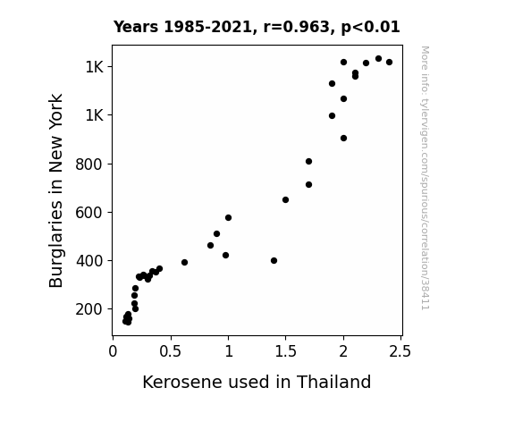 This means 92.7% of the change in the one variable (i.e., Kerosene used in Thailand) is predictable based on the change in the other (i.e., Burglaries in New York) over the 37 years from 1985 through 2021.