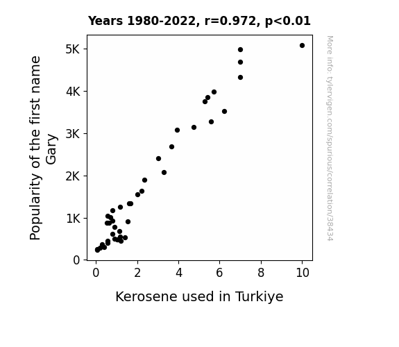 This means 94.6% of the change in the one variable (i.e., Kerosene used in Turkiye) is predictable based on the change in the other (i.e., Popularity of the first name Gary) over the 43 years from 1980 through 2022.