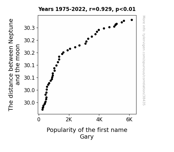 This means 86.3% of the change in the one variable (i.e., Popularity of the first name Gary) is predictable based on the change in the other (i.e., The distance between Neptune and the moon) over the 48 years from 1975 through 2022.