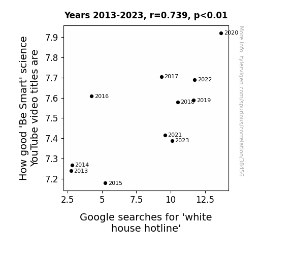 This means 54.6% of the change in the one variable (i.e., Google searches for 'white house hotline') is predictable based on the change in the other (i.e., How good 'Be Smart' science YouTube video titles are) over the 11 years from 2013 through 2023.
