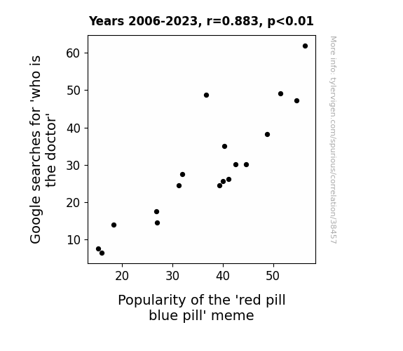 This means 78% of the change in the one variable (i.e., Popularity of the 'red pill blue pill' meme) is predictable based on the change in the other (i.e., Google searches for 'who is the doctor') over the 18 years from 2006 through 2023.