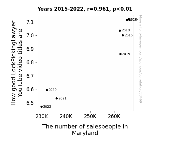This means 92.4% of the change in the one variable (i.e., The number of salespeople in Maryland) is predictable based on the change in the other (i.e., How good LockPickingLawyer YouTube video titles are) over the 8 years from 2015 through 2022.