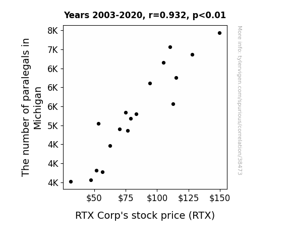 This means 87% of the change in the one variable (i.e., RTX Corp's stock price (RTX)) is predictable based on the change in the other (i.e., The number of paralegals in Michigan) over the 18 years from 2003 through 2020.