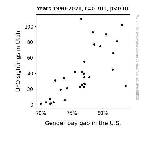 This means 49.2% of the change in the one variable (i.e., Gender pay gap in the U.S.) is predictable based on the change in the other (i.e., UFO sightings in Utah) over the 32 years from 1990 through 2021.