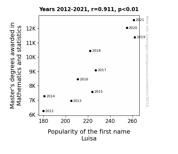 This means 83% of the change in the one variable (i.e., Popularity of the first name Luisa) is predictable based on the change in the other (i.e., Master's degrees awarded in Mathematics and statistics) over the 10 years from 2012 through 2021.
