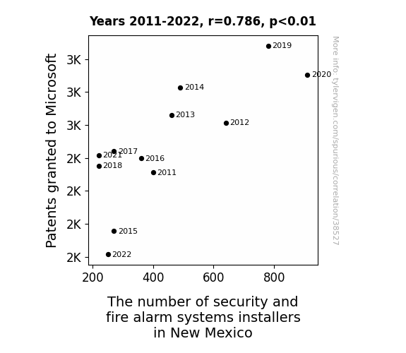 This means 61.8% of the change in the one variable (i.e., The number of security and fire alarm systems installers in New Mexico) is predictable based on the change in the other (i.e., Patents granted to Microsoft) over the 12 years from 2011 through 2022.