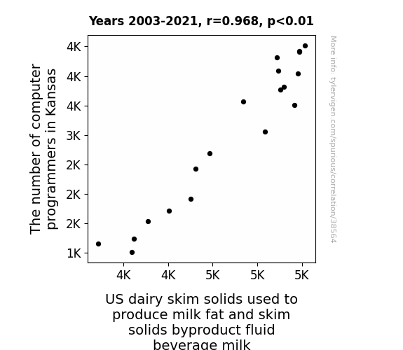 This means 93.6% of the change in the one variable (i.e., US dairy skim solids used to produce milk fat and skim solids byproduct fluid beverage milk) is predictable based on the change in the other (i.e., The number of computer programmers in Kansas) over the 19 years from 2003 through 2021.