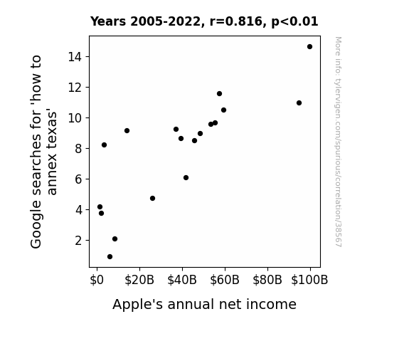 This means 66.6% of the change in the one variable (i.e., Apple's annual net income) is predictable based on the change in the other (i.e., Google searches for 'how to annex texas') over the 18 years from 2005 through 2022.