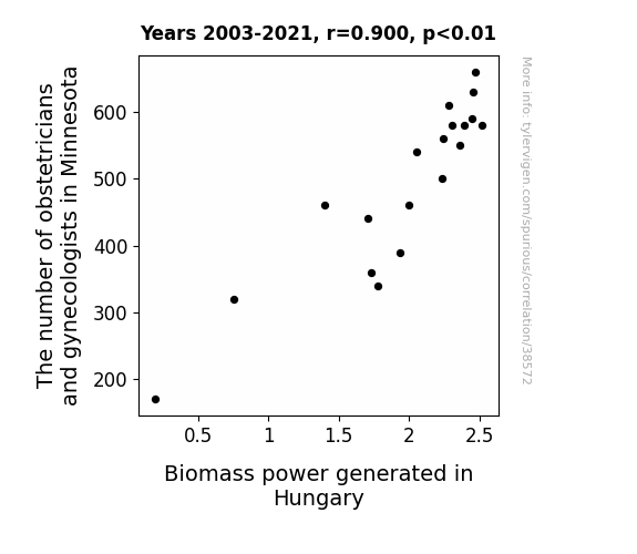 This means 81% of the change in the one variable (i.e., Biomass power generated in Hungary) is predictable based on the change in the other (i.e., The number of obstetricians and gynecologists in Minnesota) over the 19 years from 2003 through 2021.