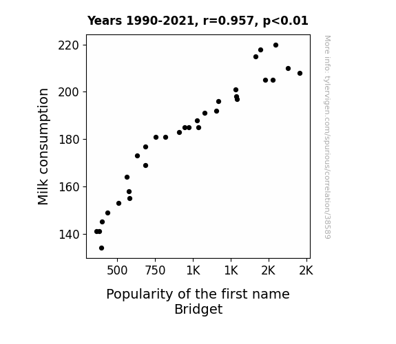 This means 91.6% of the change in the one variable (i.e., Popularity of the first name Bridget) is predictable based on the change in the other (i.e., Milk consumption) over the 32 years from 1990 through 2021.