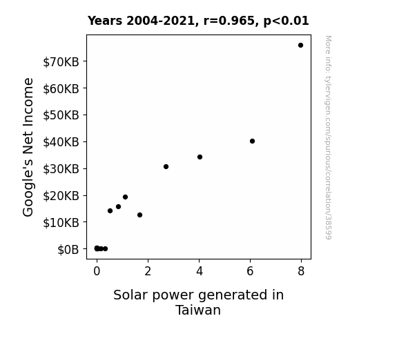 This means 93.1% of the change in the one variable (i.e., Solar power generated in Taiwan) is predictable based on the change in the other (i.e., Google's Net Income) over the 18 years from 2004 through 2021.