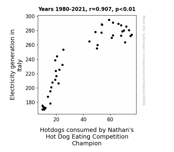 This means 82.2% of the change in the one variable (i.e., Hotdogs consumed by Nathan's Hot Dog Eating Competition Champion) is predictable based on the change in the other (i.e., Electricity generation in Italy) over the 42 years from 1980 through 2021.