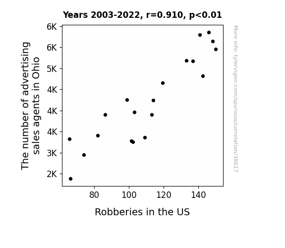 This means 82.9% of the change in the one variable (i.e., Robberies in the US) is predictable based on the change in the other (i.e., The number of advertising sales agents in Ohio) over the 20 years from 2003 through 2022.