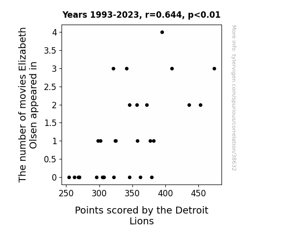 This means 41.5% of the change in the one variable (i.e., Points scored by the Detroit Lions) is predictable based on the change in the other (i.e., The number of movies Elizabeth Olsen appeared in) over the 31 years from 1993 through 2023.