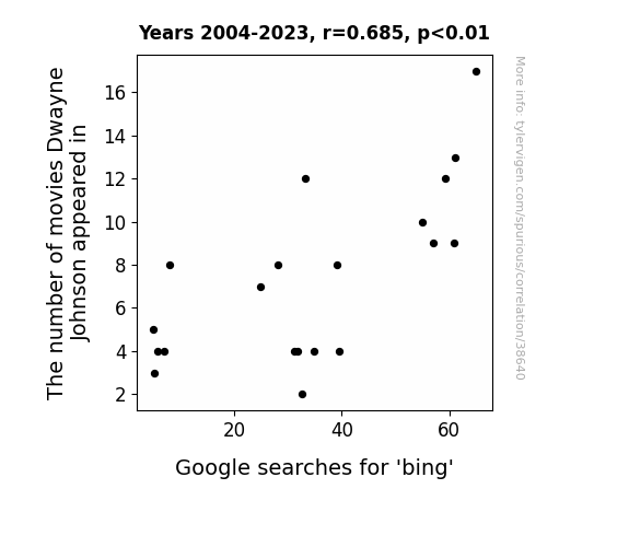 This means 46.9% of the change in the one variable (i.e., Google searches for 'bing') is predictable based on the change in the other (i.e., The number of movies Dwayne Johnson appeared in) over the 20 years from 2004 through 2023.