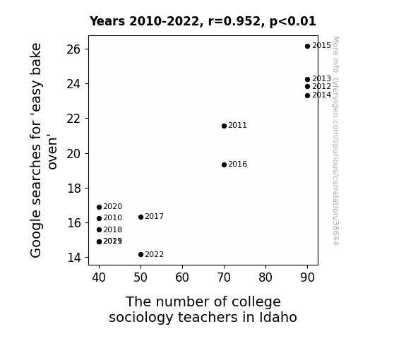 This means 90.6% of the change in the one variable (i.e., The number of college sociology teachers in Idaho) is predictable based on the change in the other (i.e., Google searches for 'easy bake oven') over the 13 years from 2010 through 2022.