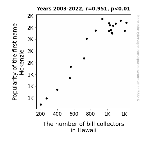 This means 90.5% of the change in the one variable (i.e., The number of bill collectors in Hawaii) is predictable based on the change in the other (i.e., Popularity of the first name Mckenzie) over the 20 years from 2003 through 2022.
