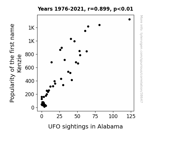 This means 80.8% of the change in the one variable (i.e., UFO sightings in Alabama) is predictable based on the change in the other (i.e., Popularity of the first name Kenzie) over the 46 years from 1976 through 2021.