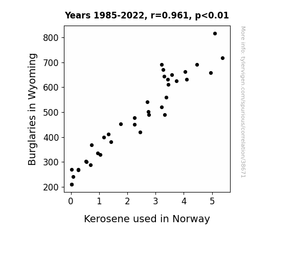 This means 92.4% of the change in the one variable (i.e., Kerosene used in Norway) is predictable based on the change in the other (i.e., Burglaries in Wyoming) over the 38 years from 1985 through 2022.