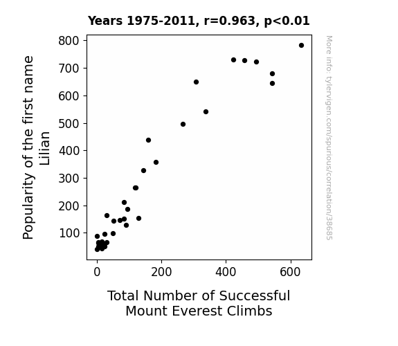 This means 92.8% of the change in the one variable (i.e., Total Number of Successful Mount Everest Climbs) is predictable based on the change in the other (i.e., Popularity of the first name Lilian) over the 37 years from 1975 through 2011.